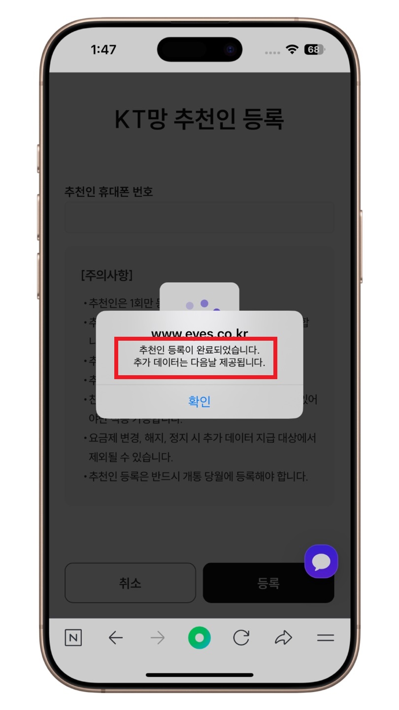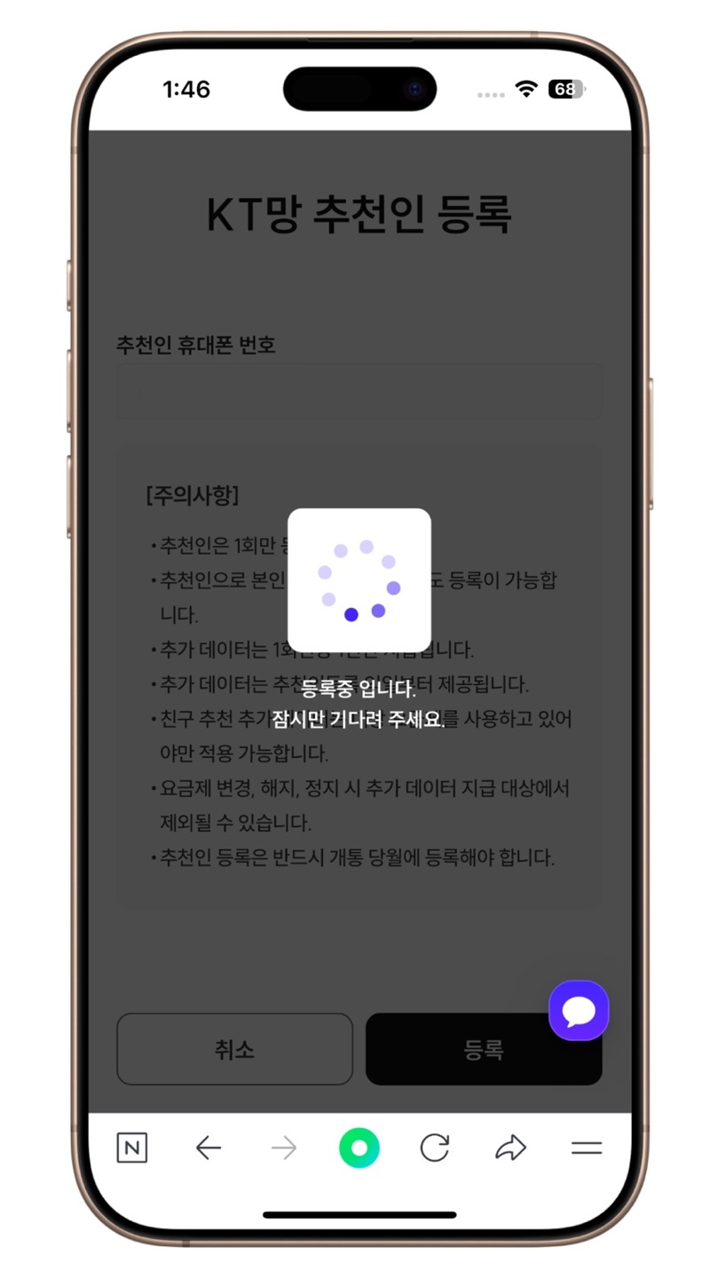 그러면 이렇게 KT망 추천인 등록페이지가 나오는데요.