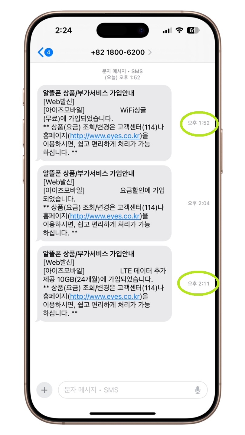 가입하고 나서 가입확인, 부가서비스 등 문자가 순차적으로 오는데요.