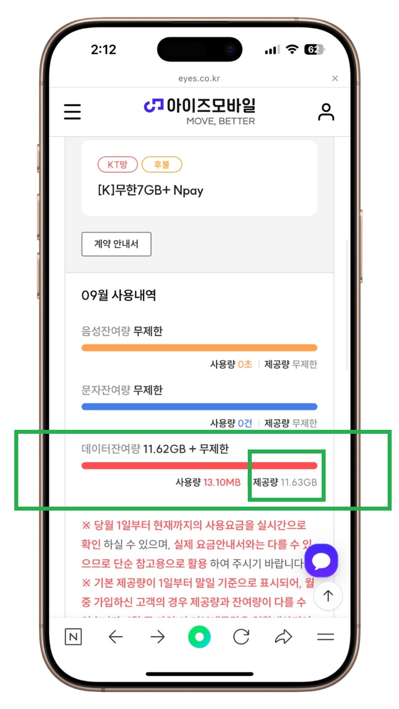 ✅ 일할계산 되지 않고 15기가 그대로 들어오네요~!