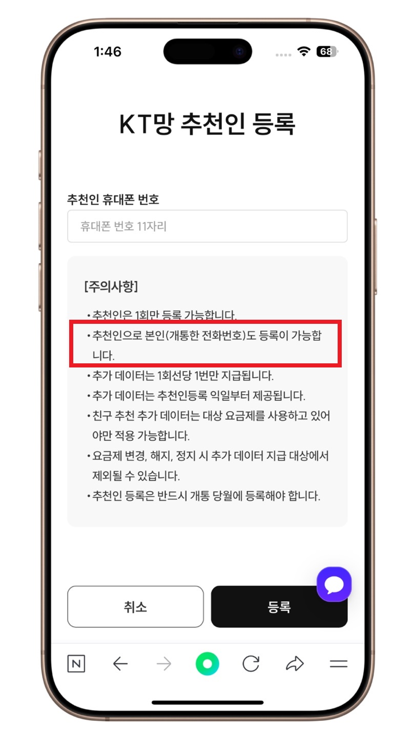 ✅ 추천인 번호에 내 휴대폰 번호를 입력하면 됩니다.