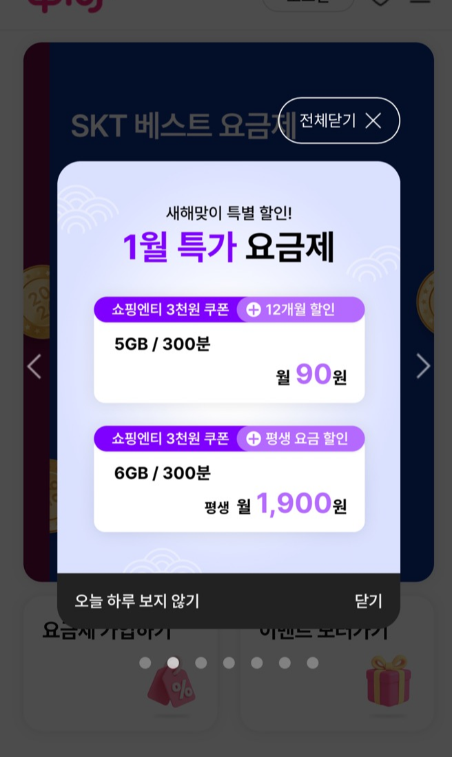 특가 요금제도 팝업에 나오는데 5GB에 월 90원으로 12개월 이용할 수 있는 요금제가 있네요!
