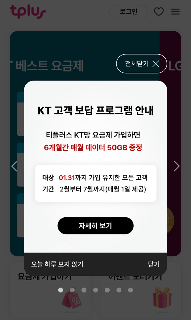 티플러스 (Tplus) 홈페이지에 접속하니 6개월간 데이터 50기가를 제공한다는 팝업이 나옵니다.