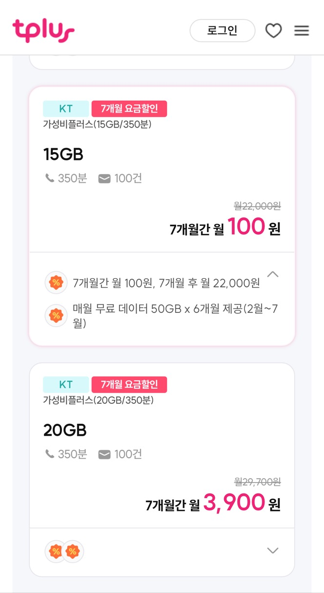 그래서 제가 선택한 요금제는 티플러스 가성비플러스(15GB/350분)