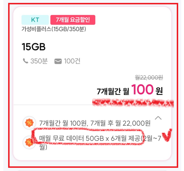 즉, 6개월간 월 100원으로 데이터 65기가를 사용할 수 있겠네요~!