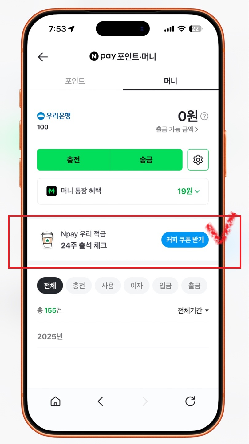 Npay 우리 적금 24주 출석체크 - 커피 쿠폰 받기 버튼을 누릅니다!