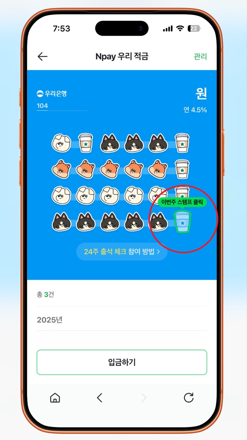 네이버페이 우리 머니통장 24주적금 출석체크를 하고 있는데요.