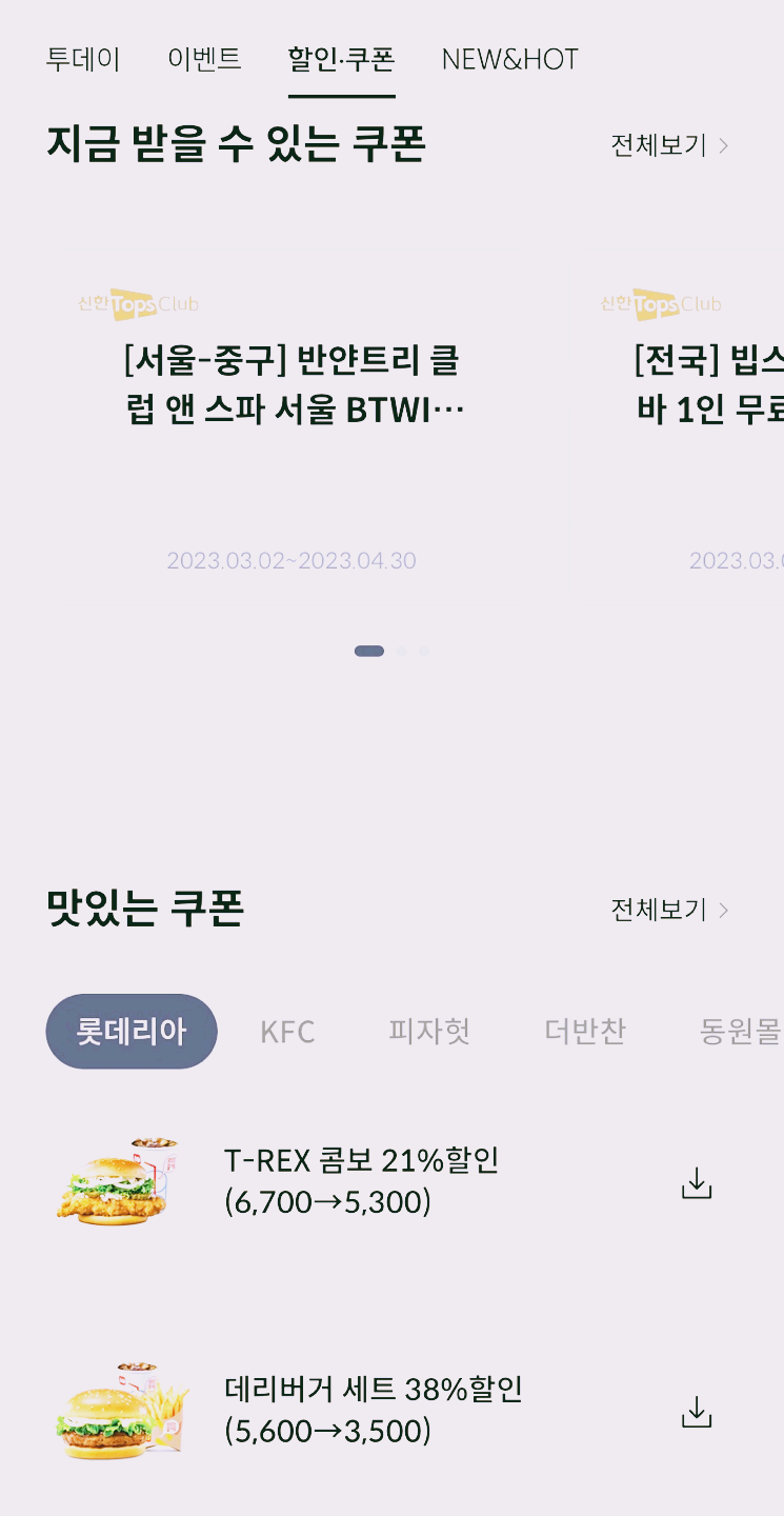 쿠폰 메뉴에 롯데리아, KFC 등의 쿠폰도 있고, 카페 할인 쿠폰도 보인다.