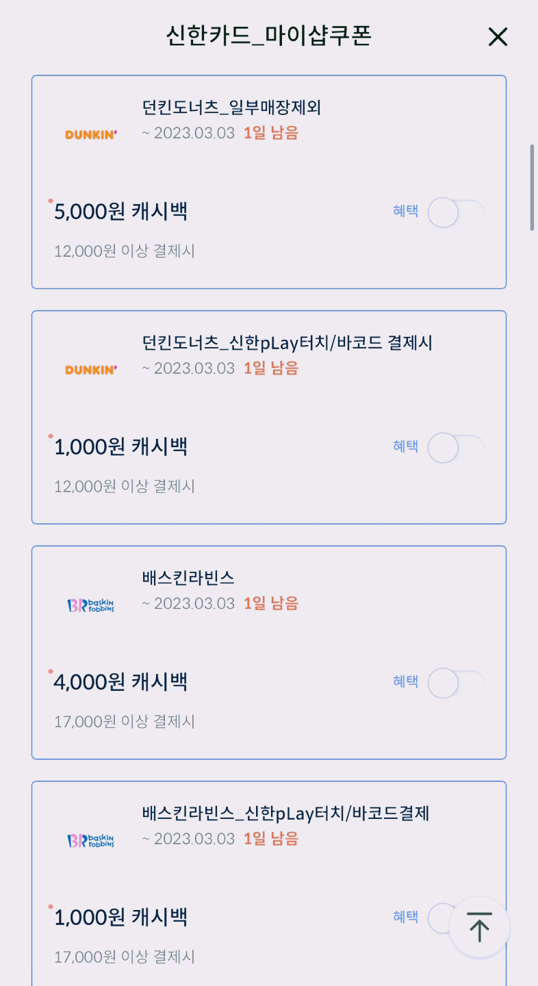 여기서 원하는 혜택을 ON 한 후, 조건에 맞게 카드를 사용하면 적립/할인 혜택이 주어진다.