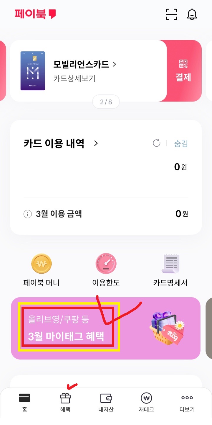 홈에서 배너로 떠 있는 [3월 마이태그 혜택]을 선택한다.