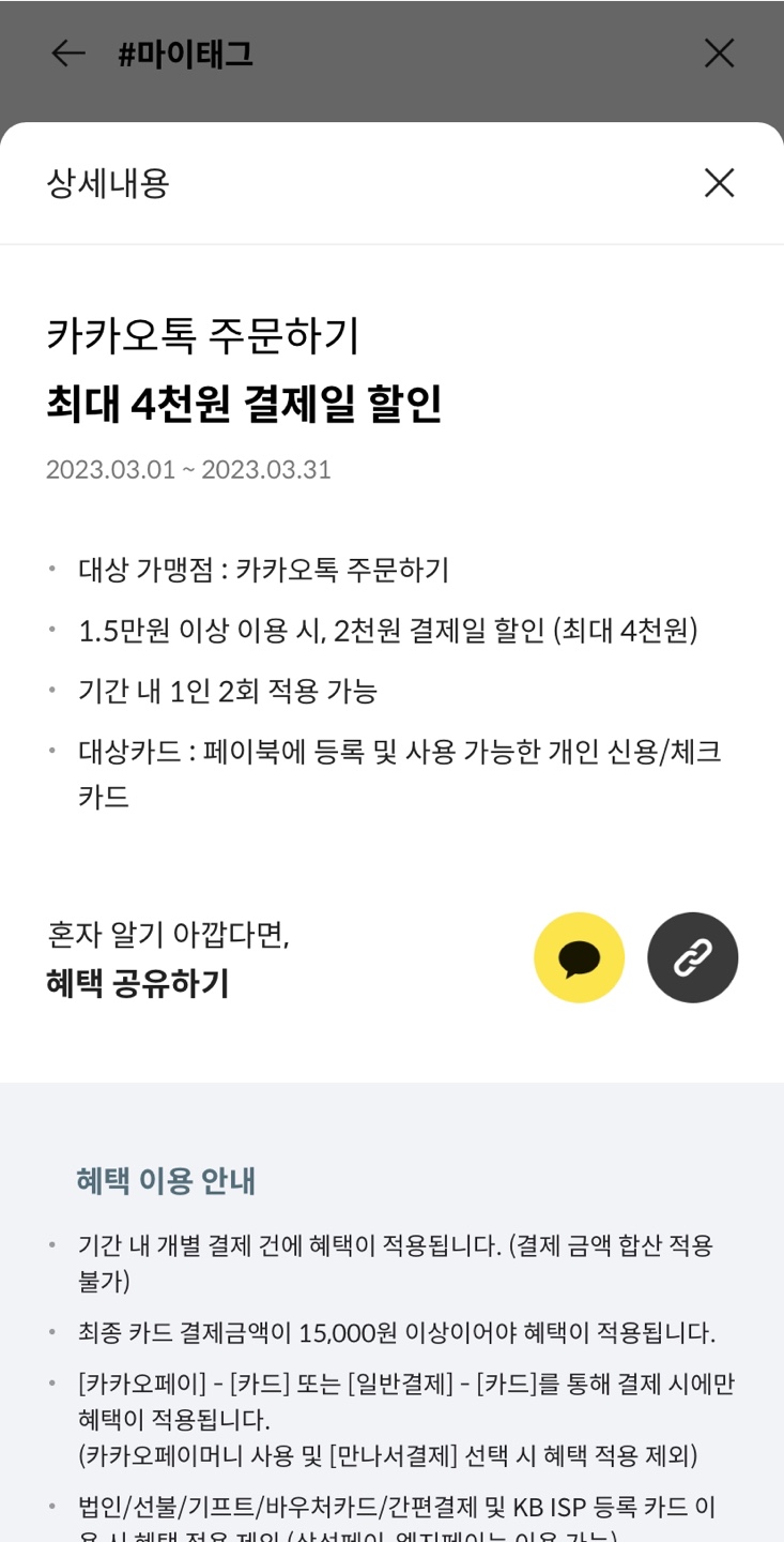 예) 위 혜택을 태그 한 경우, 카카오톡 주문하기에서 BC카드로 15000원 이상 결제를 하면 2천원 결제일 할인이 적용된다.